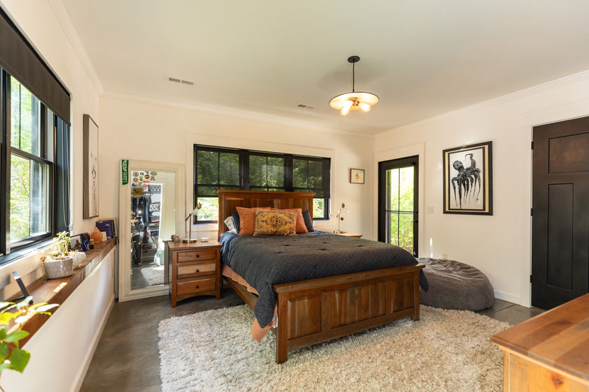 Spacious beautiful living room with natural light and gas fireplace. Modern round chandelier.